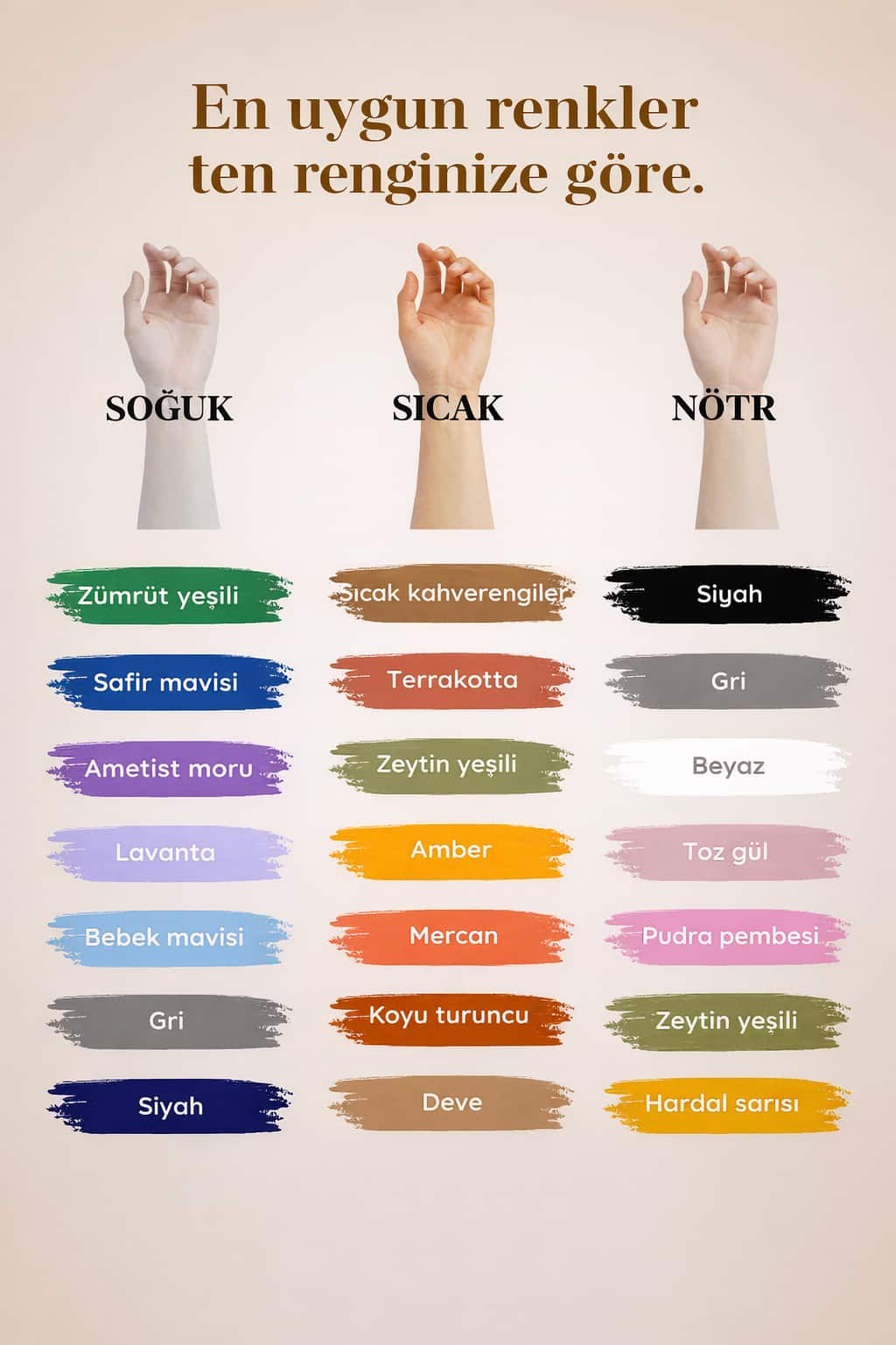 En iyi palet, ana renklerin “yumuşatılmış” halleridir. Gül kurusu, yeşim yeşili, kırık beyaz, gri-bej (greige), antrasit, lacivert ve şeftali tonları nötr ciltlerde en iyi duran renklerdir.