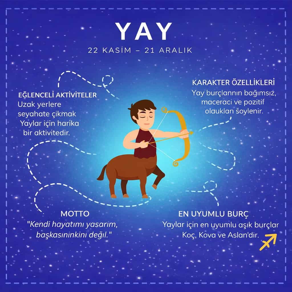Yay burcu, Zodyak kuşağının dokuzuncu burcudur ve “Kaşif” veya “Filozof” arketipiyle özdeşleştirilir. Yönetici gezegenleri Jüpiter, onlara doğuştan gelen bir iyimserlik, büyüme arzusu ve şans faktörü bahşeder. Bir Yay burcunu kalabalık bir ortamda tanımanız çok kolaydır; genellikle en yüksek sesle gülen, en heyecanlı hikayeyi anlatan veya ortamdaki gerginliği bir şakayla dağıtan kişi odur.